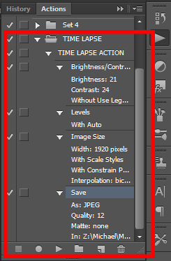 When you create a new Action, you will be prompted to name the Action and then click the Record button. From here on out, every edit you make will be recorded, even including changing the image size and saving. When you’re finished editing, your Action Set should look something like this: