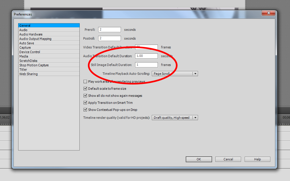 I set my Still Image Default Duration to 1 frame. If you have enough still photos, go with 1 frame. You can make the stills last longer in the video if you don’t have as many and still achieve a cool effect, but I found 1 frame to be exactly what I was looking for.